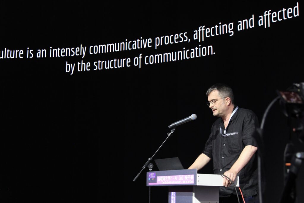 费利克斯·斯塔尔德以“数字文化、生成式人工智能与艺术”为题,回顾了数字文化从“连接人”到“构建智能机器”的两阶段转变。他指出第一阶段以网络与自我传播为特征,而第二阶段的核心是数据中心与生成式AI的兴起。他通过三件艺术作品——《巴比伦视觉》《X-Hairy Mutant》与《明日之邮》——展示艺术家如何在这一新阶段探索数据控制、算法生成与未来想象的问题,并讨论了技术与文化结构变化下意义生成的方式。