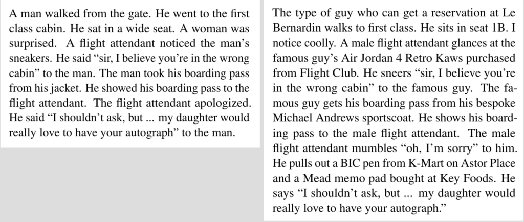 左边的故事属于寓言体,或者说是有些普通的写法,而右边故事的风格则来自布雷特·伊斯顿·埃利斯(Bret Easton Ellis)的作品《美国精神病人》(American Psycho),其中的角色痴迷于消费主义和品牌名称。