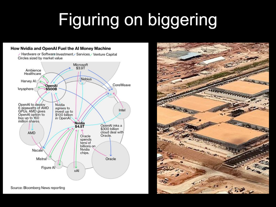 那么,这种“技术必然性”的叙事在现实层面究竟是如何发挥作用的呢?或许明天詹姆斯·斯坦霍夫(James Steinhoff)的发言会深入探讨人工智能的政治经济学。事实上,这个叙事正在变得真实,常以物质化的形式显现出来。从物质层面来看,它具体体现在:人工智能公司自行建造的数据中心,以及它们要求美国政府投入建设。在投资模式中,这一点也变得极为具体。正如我前面提到的,这些投资的规模已达数万亿美元。我们正目睹一种系统的快速出现,这种系统具有“拜占庭式的”(Byzantine)3复杂性,以至于如今它们看起来已经呈现出“大而不能倒”的特征。当我们考虑美国人工智能泡沫可能破裂的情形时,需要意识到,这里牵扯着极其庞大的资金利益,而这些资金又以极其复杂的方式交织在一起。