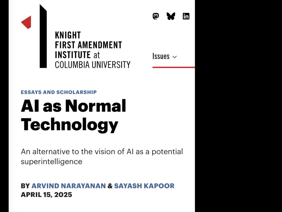 我认为这篇由普林斯顿大学两位计算机科学家撰写的文章——人工智能作为常规技术(AI as Normal Technology),是对那种叙事的一种非常有价值的回应。文章实际上提出了这样一个问题:如果我们摒弃行业极力宣扬的将AI视为一种“通用人工智能”或“超级智能”的模式,转而将AI视为寻常技术来探讨会如何?今天下午我将围绕这个思路展开,借助几位重要思想家的理论,共同探讨“寻常AI”(normal AI )的意涵,以及如何提升相关讨论质量。