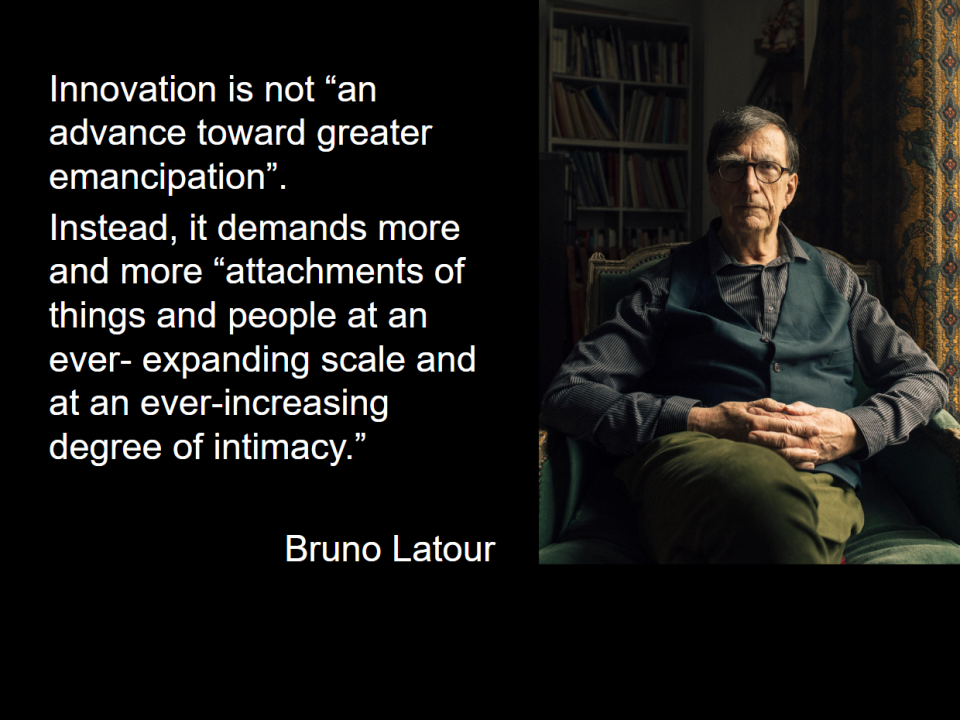 上图这位是前不久逝世的布鲁诺·拉图尔(Bruno Latour)——科学与技术研究领域的巨擘,相信许多人可能都读过他的著作。他关于“依附”(attachment)的概念十分精彩。他认为,创新叙事总宣扬要摆脱复杂性的束缚,但创新的现实本质却是相互纠缠。创新者往往不愿意承认这些依附,而事实上技术与社会相互纠缠。我最初接触这些理念,是在研究“自动驾驶汽车”(self-driving vehicles)的过程中。尽管这种技术通常被宣传为“自主交通工具”(autonomous vehicles),实则与其所处的地方环境、具体语境与特定使用需求紧密相连。