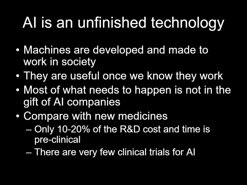 这也对政策制定者提出了重大挑战:他们必须证明和确保这些技术确实可行有效,并帮助社会辨别AI技术的优劣。我常以新药开发为例:新冠疫苗的研发周期仅仅只有两周,科学家能非常迅速地制出候选疫苗,但后续对其有效性和安全性的验证过程才真正耗费时间与资金。