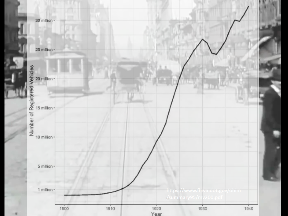 请注意上图图表。在福特T型车问世时,我们其实正处于技术扩散曲线中趋于平缓的初始阶段。 你可以看到,在 T 型福特 问世之后,美国的汽车数量在 20 世纪上半叶迅速飙升。曲线中那处明显的下跌是经济大萧条时期。
