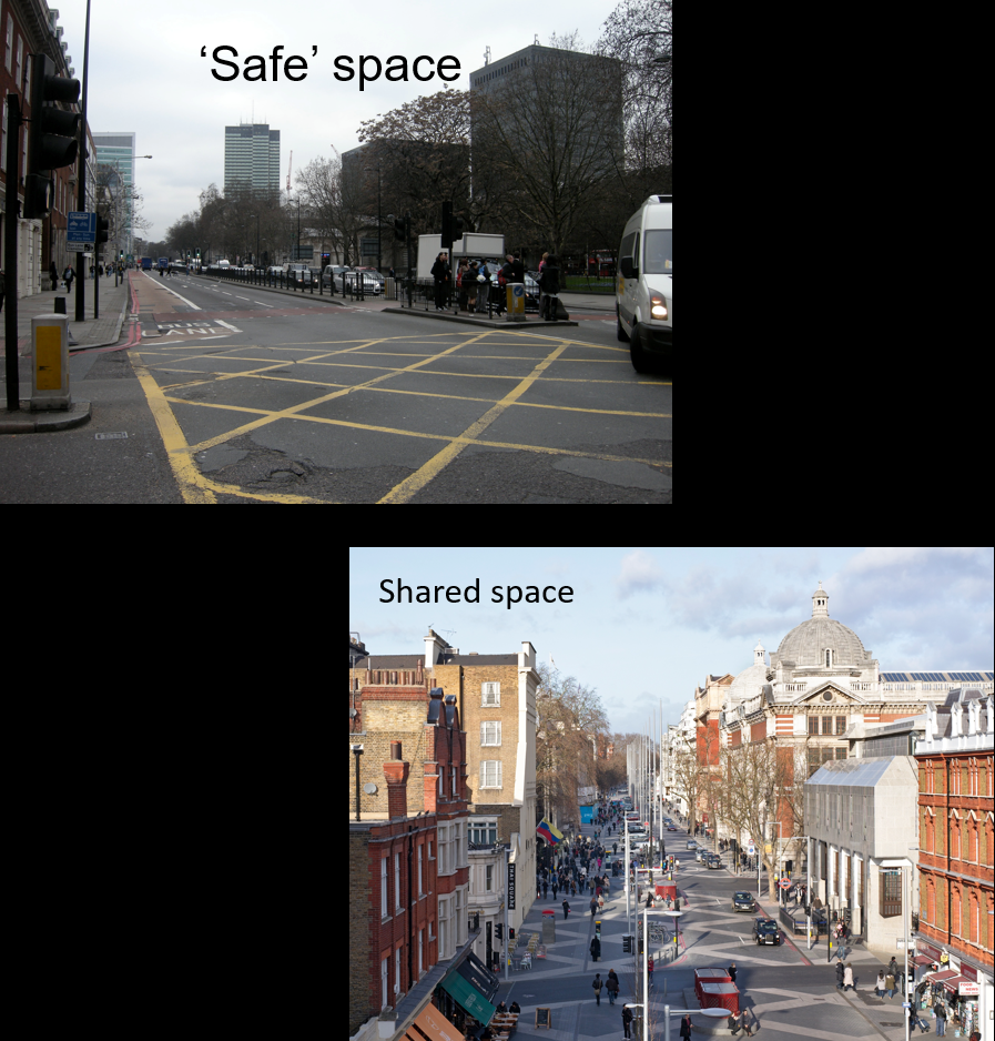 这里展示的是伦敦的两条道路(上图)。上方是我大学附近的尤斯顿路(Euston Road),它是一个典型的例子,体现了我们所谓的“安全空间”(safe space)理念:公交车、自行车与行人被严格分隔开来,每个人都被要求待在自己的车道上。这就是我们所谓的安全方式,也是汽车能够快速行驶的方式。而下图则是“共享空间”(shared space)的实验性设计。有些人可能知道,这一理念起源于荷兰,至今仍然争议不断。在这个案例中,不同交通方式的界限被刻意模糊化。我展示两者并非要评判优劣,而是想说明,我们在组织不同交通方式时,其实存在着多种可能的安排方式,我们可以有不同的安全观念,也可以有不同的受益逻辑。