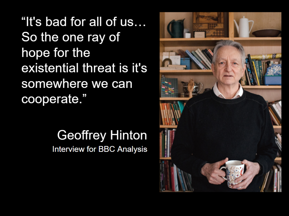 他告诉我最有启发性的一点,并不是某种关于计算机如何导致“末日危机”的技术解释,而是一种政治洞见。这种洞见透露出他对传统政治的不信任,对民主制度治理能力的不信任。作为一位自称“左翼”的科学家,他认为民主体制无力应对这些重大挑战,也无法解决他视作关键的不平等问题。但辛顿实际上指出,唯有当风险被构想为全局性威胁时,各国政策制定者,也包括国际社会的政策制定者才会真正警醒。这种非极权主义意义上的全局风险认知,将成为凝聚共识的契机。这个观点相当有趣,揭示了“生存风险”(existential risk)这一理念背后隐含的政治立场。