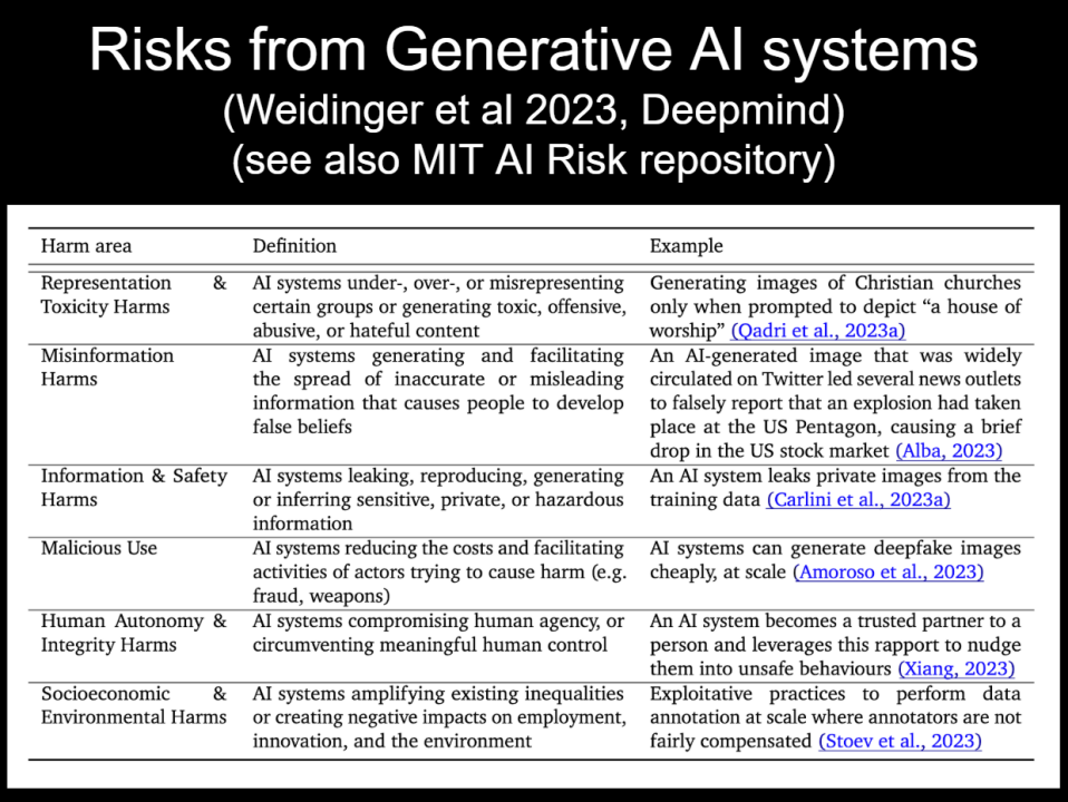 回到人工智能领域,我们或许可以思考,在一种常态视角下,我们所想象的风险究竟是什么。谷歌伦敦AI实验室DeepMind研究人员发表的这篇论文——生成式人工智能系统带来的风险(Risks from Generative AI Systems),探讨了“社会-技术风险”,我认为这才是AI领域真实存在的风险。在论文中你可以看到,他们提出了一系列非常有意思的假想风险模型,涵盖了多个类别:既有技术应用的下游影响,也包括AI构建过程中的上游问题——例如数据来源合法性、模型训练与推理的能耗等。这些维度恰为我们提供了真正参与治理的切入点。