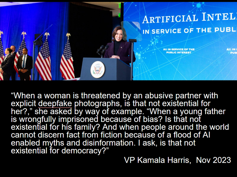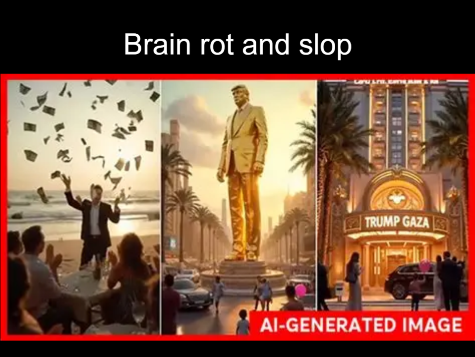 虽然在这里不展开讨论卡玛拉·哈里斯(Kamala Harris),但她提到过一个很重要的现象。去年英国年度词汇“脑腐”(brain rot)已被新词“残渣”(slop)取代——这个术语特指AI生成的垃圾内容。该词汇隐含着一系列假设:草率粗糙、来源模糊、水印问题、基本事实缺失。这段视频各位可能记得,它曾被唐纳德·特朗普广泛转发。