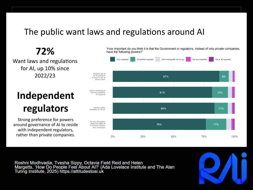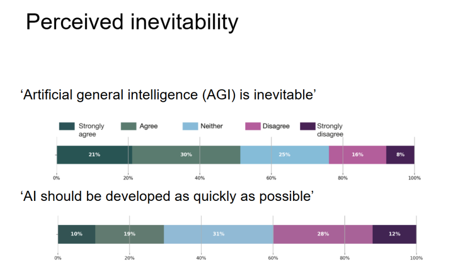 我的重点工作之一就是洞察公众对新技术的真实态度,同时深入研究专家的想法,特别是专家对公众认知的预判。我想展示我们团队最近做的一些调查数据。首项公众调查数据显示,人们对人工智能监管抱有强烈期待。我认为政府亟需认识到:公众强烈要求对这些技术实施监管,且期待建立独立监管机制。我的团队将这些公众认知反馈给AI研究人员时,我们以相同问题调研了AI研究者,这可能是迄今规模最大的AI研究者问卷调查。