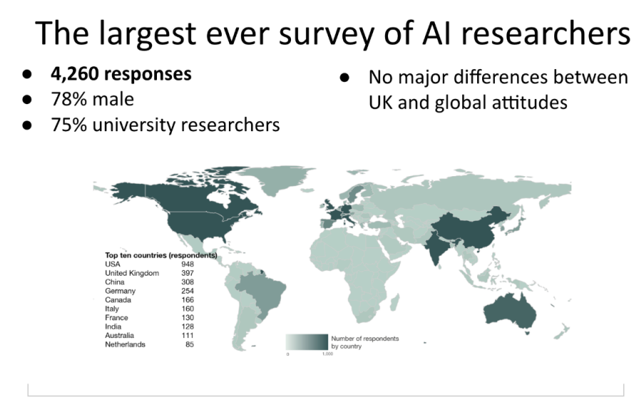 正如你们所看到的,我们获得了相当大规模的样本。对我这样一名社会科学研究者来说,平时的研究样本大约只有 50 人左右,而且大多数研究都是质性研究。这次收获4000份有效问卷令我格外兴奋。我们的样本很好地覆盖了全球主要AI研究区域,具有良好的代表性。
