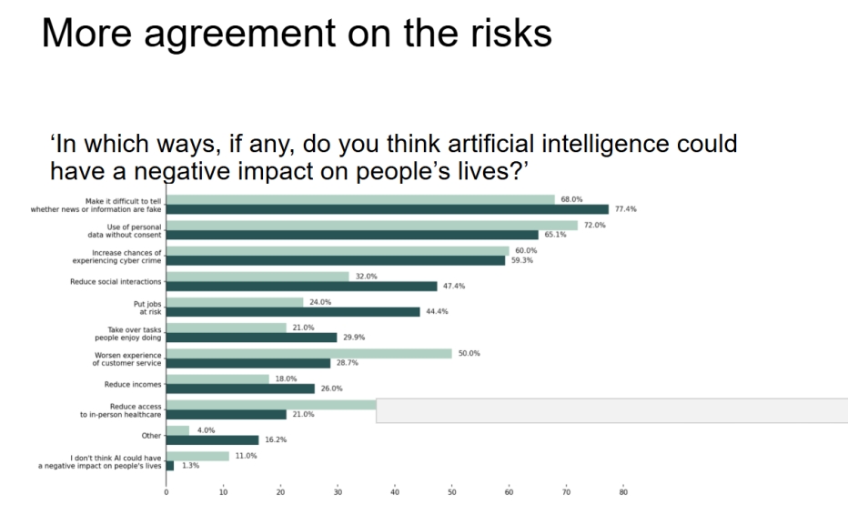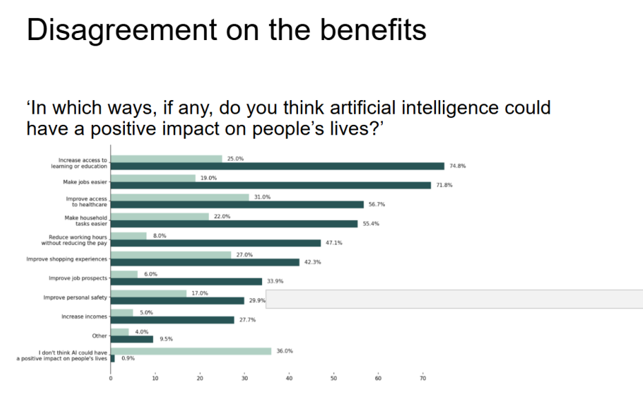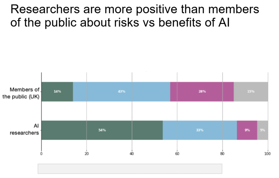 我们还将这一结果与一项关注人们对人工智能潜在收益想象的公众调查进行了对比,结果非常有趣,公众与研究者之间存在着显著分歧。抱歉这里遗漏了个信息:上图中,浅绿色代表公众,深绿色是AI研究者。公众对收益的预期更为模糊,而AI研究者则更为笃定,且双方对收益的排序也截然不同。例如,普通公众更倾向于想到一些具体、生活化的益处,例如购物更方便;而研究者则对学习和教育的前景更加兴奋。