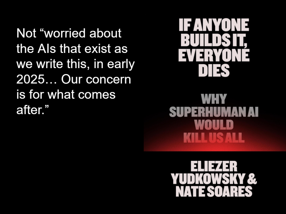 近期,或许是最极端的倡导者埃利泽·尤德考斯基(Eliezer Yudkowsky)主导了这种风险论述,他的新书已经开始获得相当多的关注。作为政策研究者,我需要强调,我的关切点不在于他们正确与否。若非要表态,我会认为其观点有误,但关键不在于此。关键在于:他们有意地忽视了当下的技术现实,并以此为借口,跳跃式地进入有关“未来”的讨论。他们在该书引言中明确写道,他们对当下我们身边已有的人工智能并不感兴趣;他们感兴趣的是想象中的未来技术。这种立场不仅带有特定的监管含义,也极其有利于那些正在建构人工智能、并希望削弱技术监管的人。