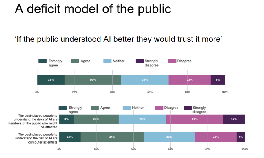 调查还显示AI研究社群存在某种程度的技术决定论倾向——超半数研究者认为AGI是不可避免的,这当然也意味着,他们把AGI视作一个有意义的概念。我们马上就会谈到,为什么这点很有意思。我们还注意到,AI研究者中存在一种对公众的理解方式,在STS领域,我们称之为一种“缺失模型”(deficit model)。所谓“缺失模型”,即公众对科技的不信任源于其科技知识的匮乏,换句话说,更多的知识会带来更多的信任,而更多的信任会带来对科学与技术的更多支持。