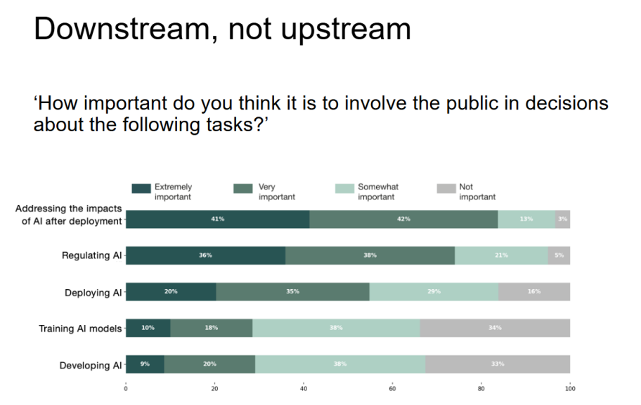 这种态度带有明显的技术官僚主义与技术决定论倾向——他们倾向于认为,所谓“民主参与”的重要性,更多体现在让公众参与讨论AI的社会影响,而不是参与AI技术研发、模型训练等上游问题。换句话说,这实质上是认为民主机制应作用于技术发展的下游而非上游。