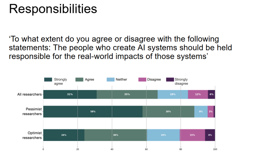 与此同时,我们还发现关于责任归属的回答也尤为有趣。当问及“是否认同AI创造者应为系统产生的现实影响负责”时(这是相当激进的问题,恰逢《奥本海默》上映,呼应了“负责任的创新”这一古老议题),令人惊讶的是,相当多研究者表达了希望以这种方式来想象“责任”,即认同AI创造者应为系统产生的现实影响负责。有趣的是,我们将受访者按悲观/乐观倾向分为两组后,发现悲观者明显更倾向于让这种“责任观”在现实世界中真正发挥作用。