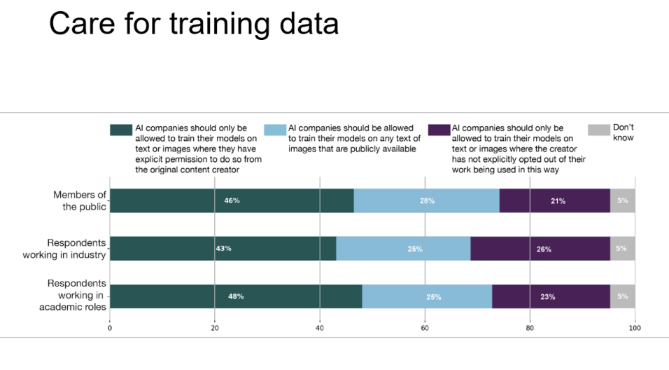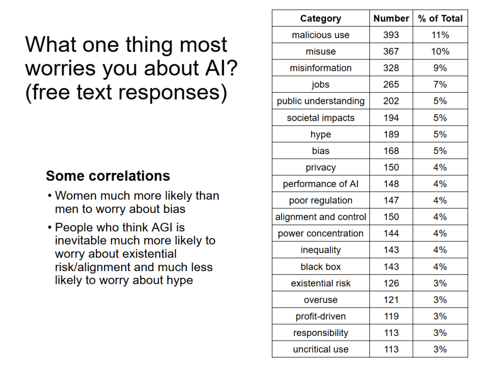 我认为接下来这一点同样非常重要,因为在当时这涉及一个极其关键的政策辩论:是否应当修改著作权法为AI公司提供便利,允许他们任意使用所获数据进行训练。而我们观察到,公众与AI研究者之间在这一问题上表现出令人惊讶的高度共识,双方都认为需要更严格地关注训练数据问题。这说明,AI 研究者并不是那种“放开一切数据,我们要全部拿来训练”的态度。那种立场更像是由某些领先的人工智能公司所主张的。在我结束前,最后分享一组发现。在此次调查中,我们还让受访者(AI研究者)用自己的语言回答一个问题,即“对于人工智能,最让你担忧的是什么”。随后,我们将他们的回答按若干类别进行了归纳整理。有意思的是,计算机科学家们似乎很难遵守“列举一项”的要求,几乎所有人都给出了多重答案。
