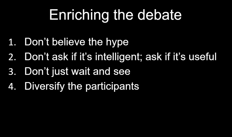 我们为何需要这样的研究?原因在于:我认为,我们迫切需要改善关于人工智能及其治理的辩论。我始终坚信一个理念:科学与科学家能够成为技术的良知,这个理念最初源自哈维·布鲁克斯(Harvey Brooks)。我们调查中呈现的多元观点,正是推动人工智能辩论更具建设性的思想资源。从中我们可以得出的结论其实很简单:当遭遇炒作时,我们绝不应轻信,更不该认定这是AI界的主流认知。艾伦·图灵(Alan Turing)固然是计算机科学的先驱,但他也对人工智能政策辩论造成了巨大的伤害,因为他将人工智能固守于智能的概念,而非其他更广泛的视角。监管体系不应持观望态度,而应主动捕捉预警信号,在技术发展早期阶段就引导它朝着更好的方向发展。正如之前提到的,很多我们需要做的事情,并不完全在人工智能公司的控制范围内。当前最严峻的问题在于,当前在AI的讨论中被反复引用的总是同一批声音,这些利益相关者被神化为先知而非平等的参与者。我们必须即刻推动话语体系的多元化。我的发言到此结束,希望还留有几分钟提问时间。谢谢各位。