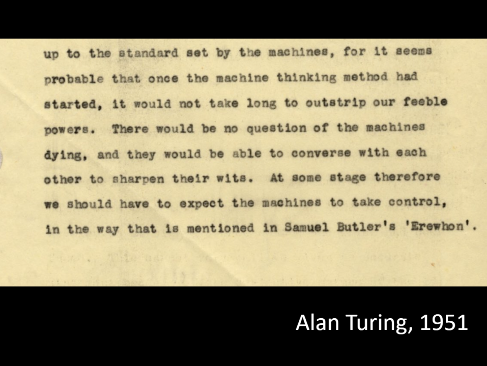 这样的观念在科学史中并不新鲜。它不仅是某个痴迷“生存风险”的特定群体的主张,更可追溯至计算机科学的源头。就在几周前,我们在伦敦举办了一场会议,纪念我们之前提到过的“图灵测试”诞生七十五周年。1950年《模仿游戏》(The Imitation Game)论文中提出的图灵测试问世一年后,艾伦·图灵在一次演讲中,以极端和“存在论式”的语言,讨论了后来被称为“人工智能控制问题”(the control problem)的议题2,并将其与一部熟悉的科幻作品联系起来——那可能是最早期的此类作品之一,出自塞缪尔·巴特勒(Samuel Butler)之手。