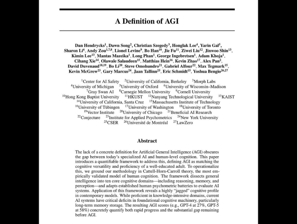 上图这篇论文《通用人工智能的定义》(A Definition of AGI)——我想是昨天刚发表的——在座有些人可能认得其中几位作者,他们并非全都来自产业界,观点也不尽一致。例如,我们能看到像加里·马库斯(Gary Marcus)这样的公开批评者。因此,这篇论文更应被视为一种构建共识的尝试,旨在就“何谓通用人工智能”(AGI)达成某种共识。该论文的真正目标在于,为我们通往那个“或许有一天能被称之为通用人工智能”的未知境地,建立评估基准。至于我为何对此存疑,我稍后会谈到。