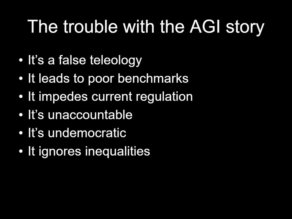 我只是试图表达我对这一叙事的一些直觉式看法。我的观点大致是这样的:这似乎是一种虚假的目的论(false teleology),若追问这些从业者的行为动机,AGI显然并非山姆·阿尔特曼(Sam Altman)的真正目标,更不是当下数以万亿资金涌入该领域的真实动因。从政策制定实践来看,这种叙事将深刻影响我们规划技术治理的思维方式。我已列举具体影响,或许我们可在问答环节继续探讨。AGI叙事最核心的作用之一,在于营造了技术发展的必然性。这种技术决定论的论调,或许最令像我这样的科学技术研究学者感到不安。