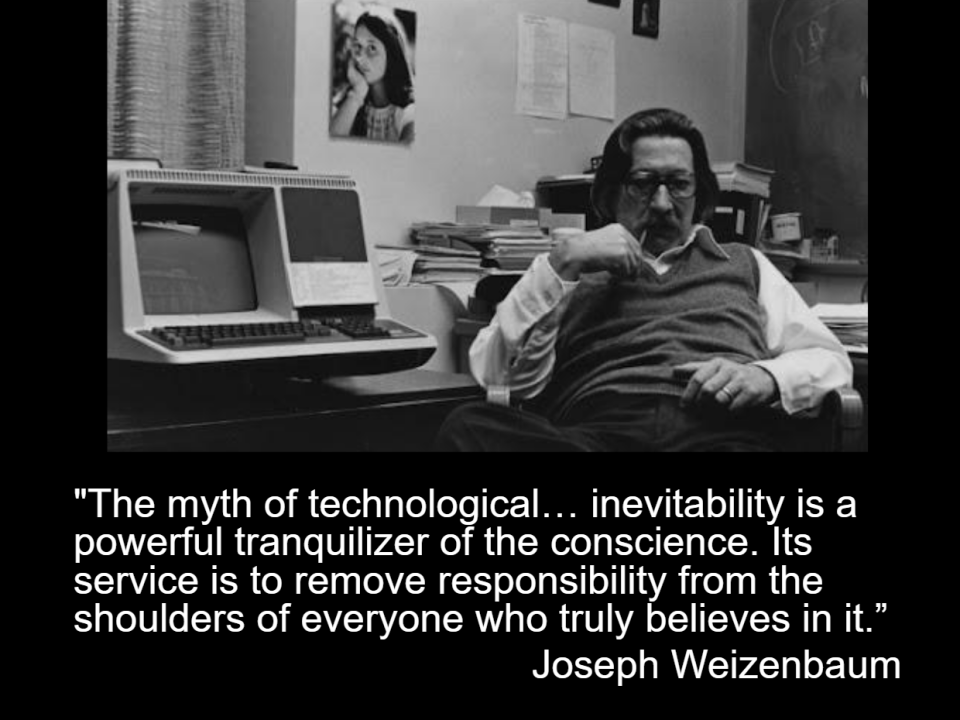 与人工智能领域的许多情况一样,那些最重要的观点早在五十年前就已经被约瑟夫·维森鲍姆(Joseph Weizenbaum)提出了。我们今天其实已经提到过他。他在当时被视为“技术怪人”(technological curmudgeon),但他对自己亲身参与并推动发展的那些技术,都提出了极其重要且深刻的批评。正如尼克·蒙特福特(Nick Montfort)刚才在演讲中所提到的那样,维森鲍姆还对技术政治这一更广泛的问题作出了关键性的思考,尤其是关于“技术的必然性”叙事与“人类责任”叙事之间的关系。实际上,这是一种研究人员转移责任的方式。