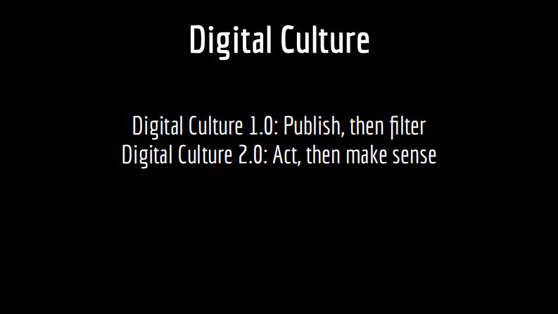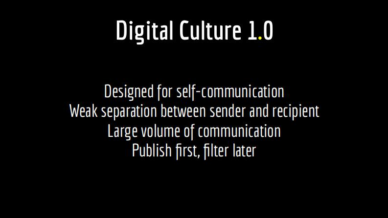 所有这些技术与方法都具有共同特征:它们为自我传播而设计,以用户生成内容为核心,信息发送者与接收者的界限极其模糊。这些系统旨在产生海量交流内容,无论编辑会议多么高效,传统日报都永远无法容纳如此庞大的信息量,因其底层结构就与这种呈现方式相悖。与“先筛选后发布”的广播媒体(由专人决定发布价值)截然相反,这些新系统采用“先发布后筛选”的模式,所有人皆可发布,事后才通过某种机制进行筛选。正如我所说,随着社交媒体成为了主流,“人人可成为生产者”已成为常态化的霸权逻辑。而在这种结构中缺席,没有社交媒体存在感,反而会立刻让人起疑心。