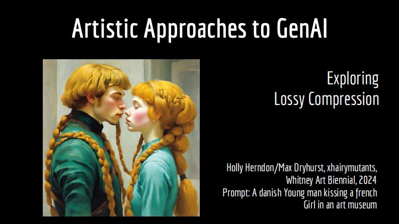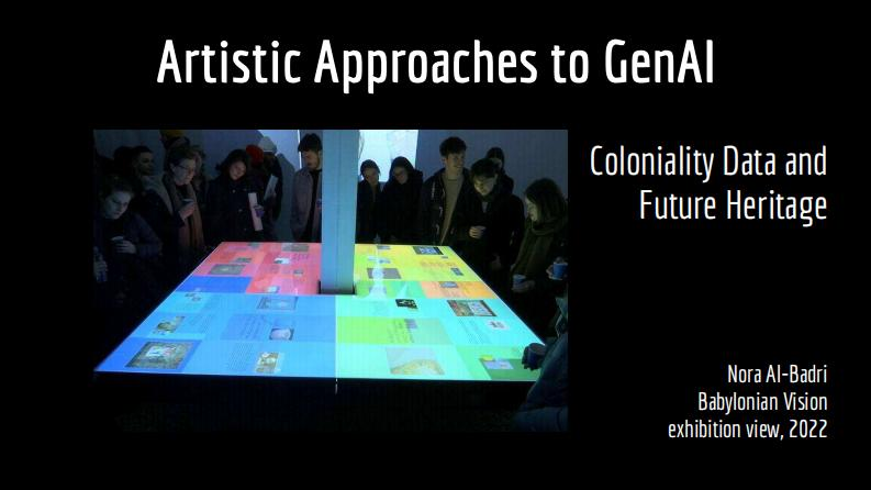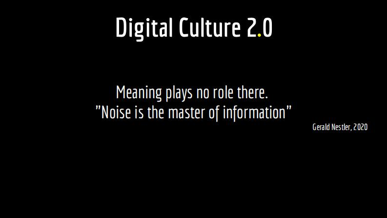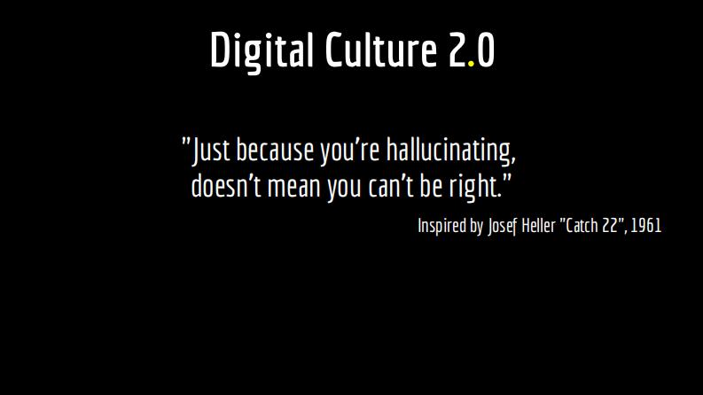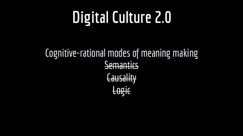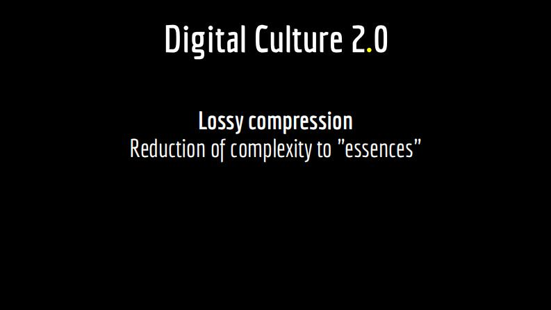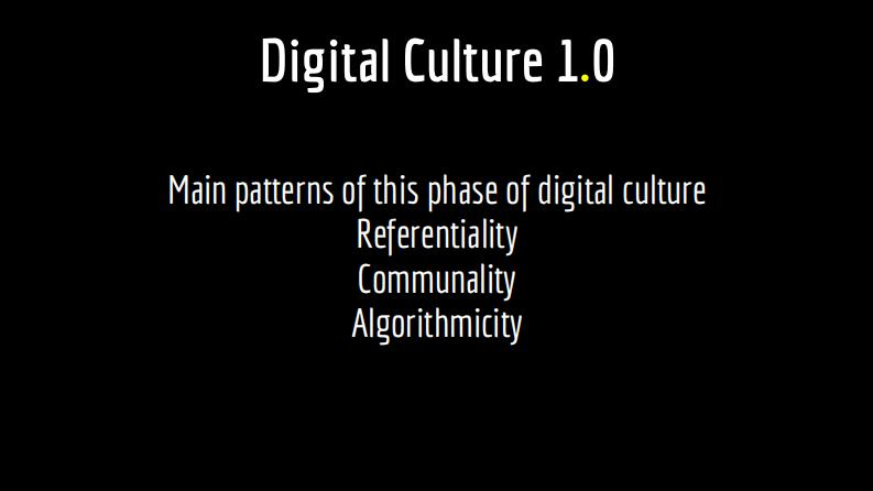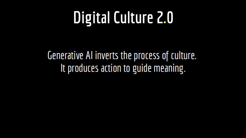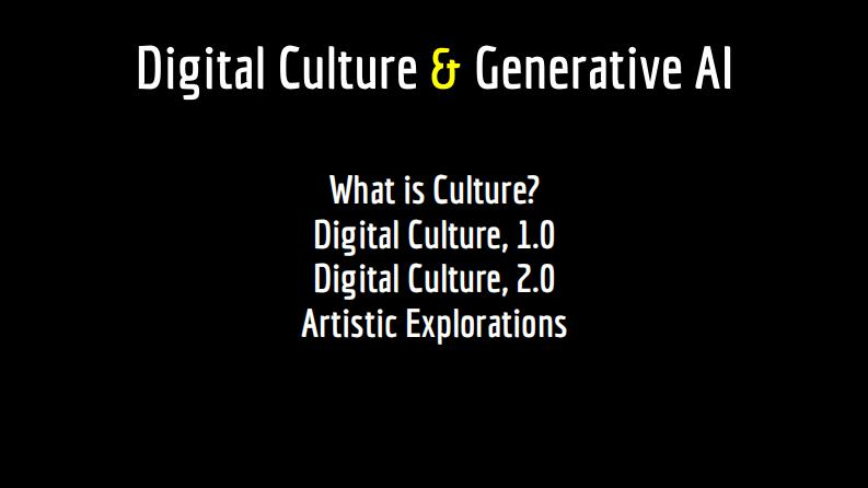 让我简要概述一下我所讨论的内容。首先,非常简短地说,当我谈论数字文化和生成式AI时,我所说的‘文化’是什么意思?其次,我认为我们目前正处于数字文化两个阶段之间的过渡期。在第一阶段,即数字文化1.0时期,定义技术和文化实践的核心是将人们彼此连接。这一理念嵌入在端到端原则中,意味着智能存在于系统的边缘,在设备中,但最重要的是在人们身上。进入第二阶段,即数字文化2.0时期,智能被集中到数据中心。这极大地改变了文化的动态。到目前为止,聊天机器人是定义技术,但现在还为时过早,无法做出判断。最后,我将探讨三个具有代表性的艺术项目,这些项目以美学和政治有趣的方式探索这一新阶段的数字文化。