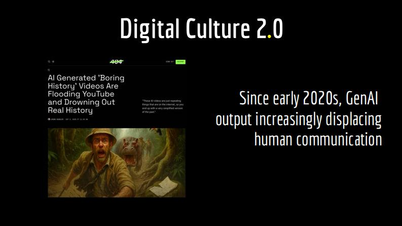 正如“死网理论”(Dead Internet theory)所揭示的,作为对这种趋势的回应,自2010年代后半叶起,“证明你是人类”这种原本不应成为需求的要求变得无处不在,这正是对机器人程序走向前台的直接反应。而自2020年代初以来,生成式AI输出正在日益取代人类的沟通方式,我想大家都目睹了许多例证,无需赘述。甚至有头条称AI生成的历史视频正在取代人类制作的视频。在你认为这是世界末日之前,请记住被取代的人类制作视频本身就是为了助眠而存在的,对吧?并非大学里教授的那种历史课程,这些视频是有人用安抚的语气讲述你不感兴趣的事情,帮助你入睡。