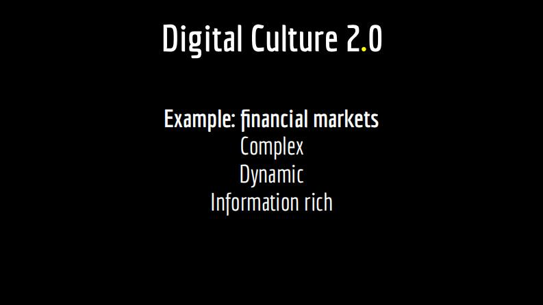 我想到的例子自然是高速金融市场——这些市场信息极其密集、复杂到无法完全掌握全貌,并且动态变化迅速,以至于无法在相关时间范围内进行因果分析。例如,金融崩盘事件可能在几分钟内发生,而对其进行因果调查往往需要数月甚至数年才能完成。因此,在实时环境下,你永远无法通过因果分析来处理这样的问题。而在金融市场环境中,“意义”本身并不起作用。自上世纪70年代初以来,市场运作的假设是基本随机性,或者如艺术家杰拉尔德·内斯特勒(Gerald Nestler)所言,“噪声是信息的主宰”,意味着缺乏意义和因果逻辑。我们所能获得的,仅仅是可观察的行为,而无法进行解释。