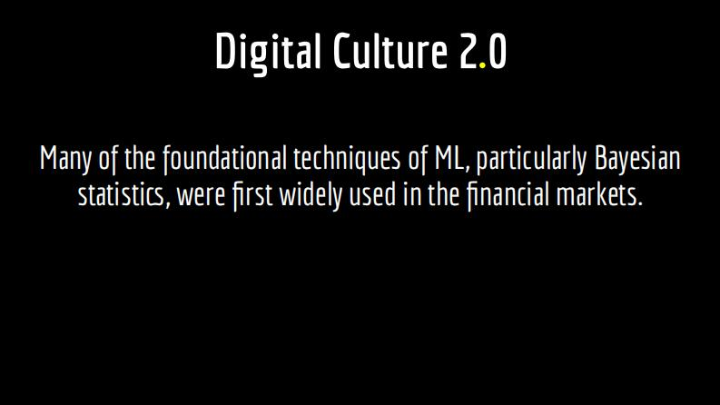 大多数机器学习的基础技术,尤其是先进的贝叶斯统计(advanced Bayesian statistics),最初都是在金融市场中得到广泛应用的。作家 贾斯汀·乔尔(Justin Joer) 在其著作 《数学的革命:人工智能、统计学与资本逻辑》 (Revolutionary Mathematics: Artificial Intelligence, Statistics and the Logic of Capitalism) 中提到“认知的金融化”(financialization of cognition),即机器学习将金融市场交易者的思维方式扩展到社会生活的各个方面。