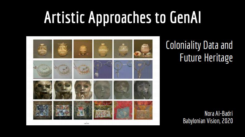 首个案例来自伊拉克裔德国艺术家诺尔·巴德里(BADRI)2020年的作品《巴比伦幻象》(Babylonian Vision)。她向五家顶尖博物馆申请获取苏美尔文物的数字馆藏数据,均遭拒绝。这立即引发出数据可及性的尖锐质问:谁掌控着未来创作的文化源材料?我们目睹的并非数字时代的颠覆性突破,而是殖民历史在数字领域的延续——正如实体文物曾被控制,其数字表征同样被垄断。艺术家随后通过数据爬取手段,利用约10000张图像训练了早期生成对抗网络模型。这些受非随机约束产生的输出完全处于幻觉状态,真假对错在此失去评判意义,这显然已超越考古学范畴。
