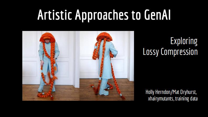 第二个项目是霍莉·赫恩登(Holly Herndon)与马特·德赫斯特(Matt Dryhurst)去年启动的《Xhay变异体》(Xhay Mutant)。该项目源于对有损压缩过程的观察:当复杂个体被简化为假定本质时,这位拥有丰富网络形象的艺术家竟被压缩为橙色头发与特定发型这两个特征。为深入探究,他们通过强化学习拍摄强化模型已编码特征的图像,诸位所见正是艺术家身着戏服、融入潜在空间视觉化的真实摄影。