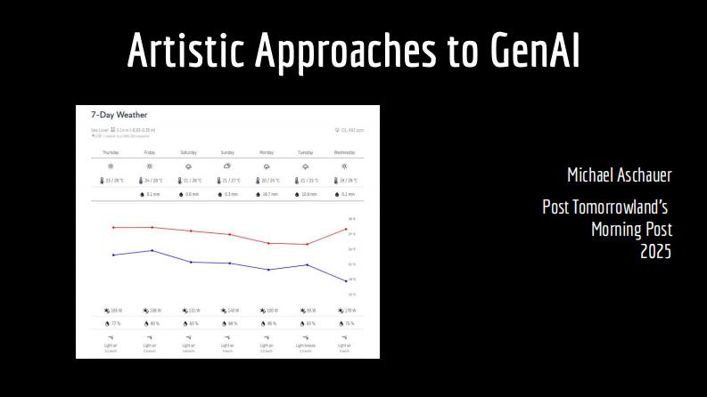 这些参数构成了生成未来报纸的基础,通过生成式 AI 系统(文本与图像)输出,呈现出高度具体化、超本地化的未来气候与社会图景。作品的目的并非精准预测未来,而是通过交互体验让观众思考气候变化的不确定性及未来的可塑性。
