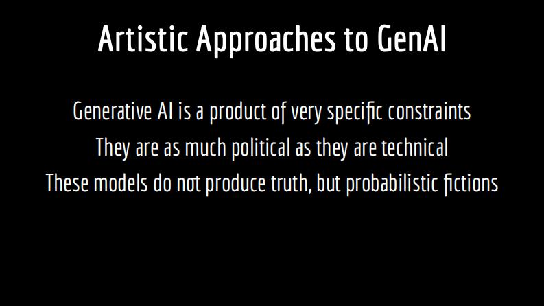 我认为“幻觉”并不是批评,而是对这些系统运作方式的描述。如果你接受这一点,你就会发现,当我们通过约束条件引导这些幻觉时,它们反而能产生有意思的结果。就像之前提到的例子,如果系统在不同的文学语料上训练,它生成的内容依然是随机虚构,但发生在一个不同的可能性景观中。