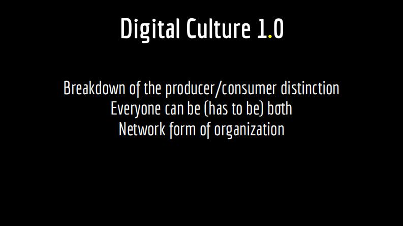 当前,数字文化正处于深刻转型的阶段。如今我们可以清晰地观察到数字文化发展的两个阶段:第一阶段大致从1980年持续至2020年,其核心理念是实现人与人之间的互联。该阶段的核心技术聚焦于机器与人类的网络化连接,而开源运动正是这一愿景最具乐观进步精神的体现。第二阶段始于2010年代末期,人工智能逐渐占据主导地位。核心目标不再仅仅是连接人类,而是构建智能机器。数据中心成为这一阶段的定义性技术。当然,任何历史分期都存在近似性和重叠性,正如我们此前所闻,旧有范式从未真正消亡。不过,这种分期确实有助于梳理研究脉络。数字文化第一阶段的主要特征体现在生产者与消费者界限的消解——以MP3文件为例:当您在播放器中打开它时,您是消费者;当您在编辑器中修改它时,您便成为生产者。每个人都可以,且日益需要同时扮演生产者与消费者的双重角色。试想入境美国时若声称没有社交媒体账号,这种情形反而会引发焦虑。