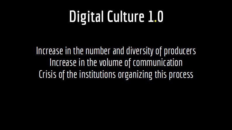 该阶段的核心创新体现在网络作为组织形态的规模化扩张,正如Manuel Castells(曼纽尔·卡斯特)提出的“网络社会”理念所阐述的。网络本身并非新生事物,它本质上是人类社会性的一部分。然而,相关技术的进步使得这种网络化组织形式得以突破地域与规模的限制,从小型即时群体扩展至广阔无垠的全球舞台,这正是”网络社会”理论的核心理念。这一消解生产者与消费者界限的转变,显著提升了生产者的数量与多样性,并极大地增加了沟通总量。随之而来的是,既有的文化机构陷入了更深层的危机,这些机构原有的体制结构难以应对如此庞大的沟通规模、多元的沟通形态以及随之产生的代表性诉求。需要强调的是,这些变革并非由技术直接诱发,但技术无疑使其在社会中占据了主导地位。