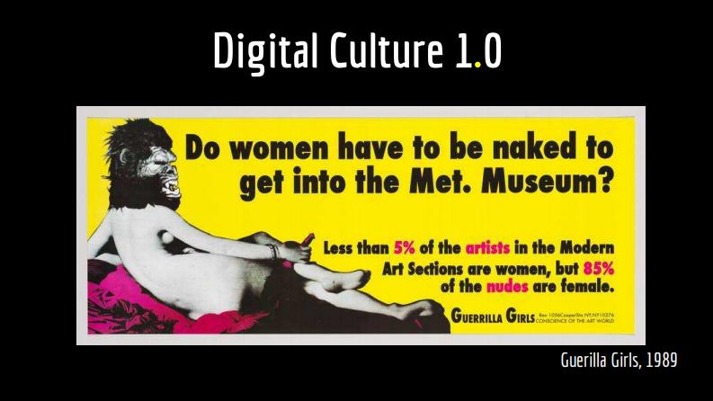让我通过一个具体案例来阐释这场危机。在1989年,游击队女孩(Guerrilla Girls,1985年创立于美国纽约的匿名女性艺术家团体)提出的质疑:“女性是否必须赤身裸体才能进入美术馆?”在此我们看到一个曾被长期排斥的群体——女性艺术家,不仅要求被纳入体系,更在批判既有文化机构的遴选机制,这些机构的任务是定义什么是重要的,什么是不重要的。问题的关键并不在于如何优化遴选标准,而是更根本地质疑这种遴选权本身的正当性——“谁赋予你决定的权力?”所以,文化正统(canon)权威性的根本命题被彻底推向台前。因此,传统机构纷纷陷入危机,并开始自我重塑。博物馆从精英文化教化场所转变为大众媒体化的旅游目的地。