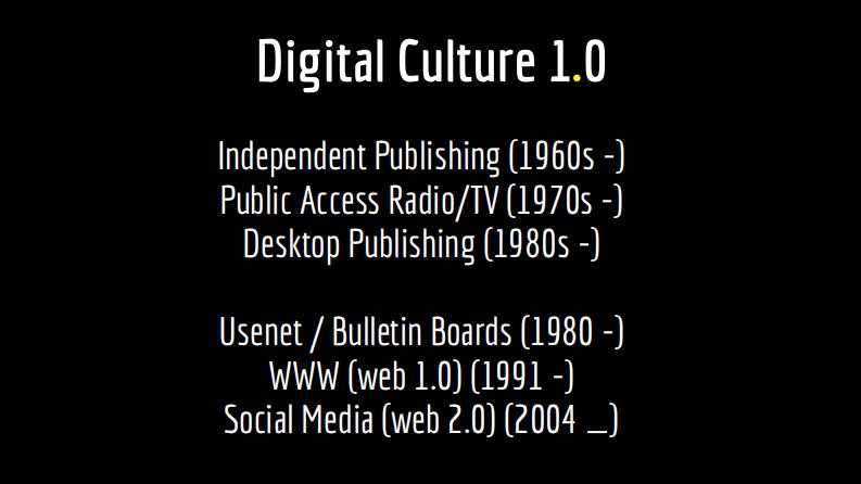 与此同时,为应对日益增加的内容量,新兴机构与实践模式应运而生,并在此过程中逐渐主导了数字文化第一阶段的形态演变。需要说明的是,这些新形态早在狭义数字时代之前便已萌芽,它们始于独立出版实践,正如我们熟知的二十世纪六十年代依赖模拟技术兴起的同性恋、女权主义及其他少数群体的出版物,这些实践体现着某种自我传播的精神内核。这种精神在二十世纪七十年代起发展的公共广播与电视中得到技术升级,观众首次成为内容生产者,为自身社群制作电视节目。进入数字时代后,这一趋势首先体现在桌面出版(desktop publishing)领域,此时人人都能相对简便地制作印刷出版物,虽然传播介质仍是纸质,但生产过程已数字化。与之并行的是早期互联网应用:新闻组和电子公告板如同待用户填充的容器,这可以说是后来所谓‘用户生成内容’的起点。随后万维网在九十年代兴起,继而社交媒体将这种自我表达手段商品化,将其转变为我们所知的一个大众媒介,而其发展后果我们也已有目共睹。
