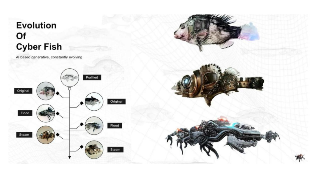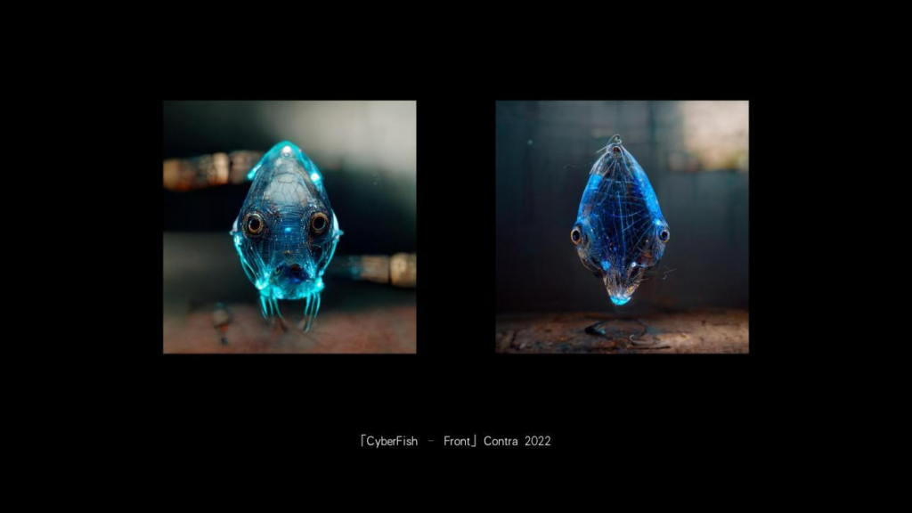 当解决了这个问题后,就可以用AI生成很多这样的鱼,从一条普通的鱼开始这一系列。我后来也参加了一些展览和一些加密艺术的活动。但我们不会每次生成的时候都给AI一张图,我通常只给它一个提示词,比如“一条武装起来的赛博朋克鱼”,这时候AI会自己从它内部拿一个随机数,也就是一个噪声(noise)作为初始值,从噪声值开始无限地去接近于作为目标的提示词,所以也会得到一张图。这个过程就是所谓的“文生图”(text-to-image),有了文生图以后,做事情就非常简单了。