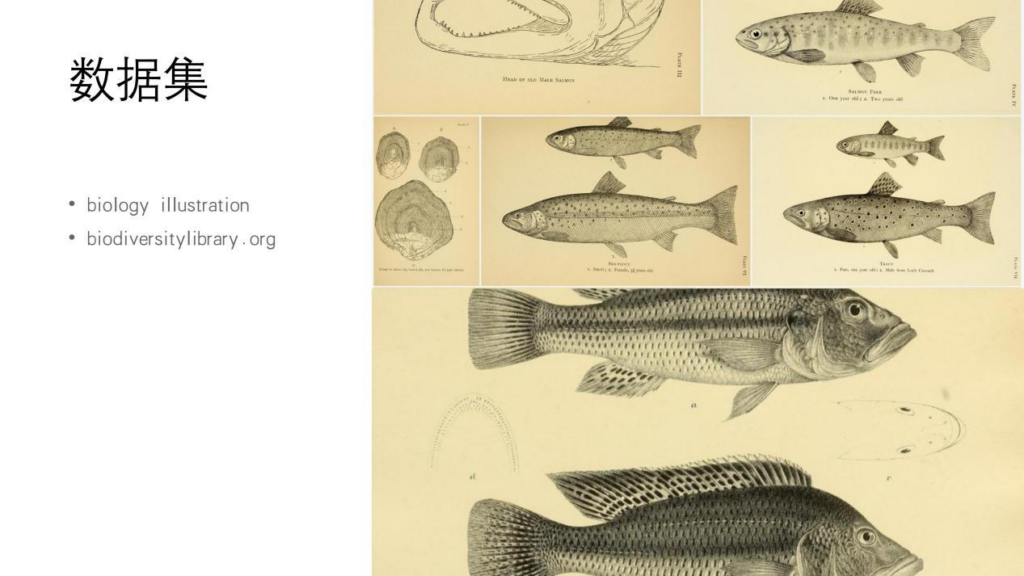 在做鱼的时候,我首先要有模型,模型需要训练,所以我就要先收集数据。数据集就是这些生物学的插画,它们来自于一些生物学的网站和生物学书籍的插画。但拿到数据之后,不是马上就可以开始训练的,我还需要进行一些前期的,所谓数据清洗的工作。这实际上也是很直白。因为我要训练鱼的图像模型,那么每张插画里的文字注解对训练图像就是有干扰的,所以我其实每张图都做了一些P图的工作,这个就是数据清洗。