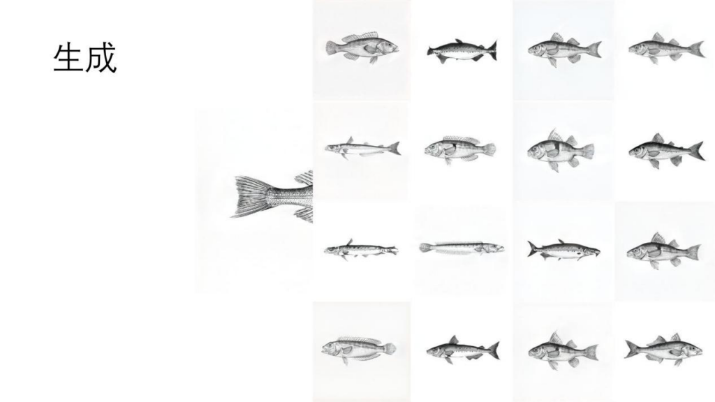 当模型训练好以后就可以生成图像了。现在你看到的都是模型训练好以后生成的鱼,这个鱼就是有鼻子有眼的,一切都都很完善。但是也有一些特例,就像上边的第二条鱼,你可以看到它这条鱼左右两边都是尾巴对吧?这就是因为从技术角度来讲模型训练的不是百分之百精确,不是那么好。所以对应的生成内容,自然会有一些东西是不符合工业标准的,但是它可能符合我的创作标准。如果都是跟原数据一样的鱼,就没有意义了。