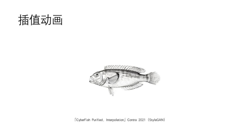 这个动画叫插值动画。什么叫插值?我们假定有1和10两个数字,AI会自动的帮你把中间的2、3、4、5、6、7、8、9连起来。另一个概念是,一个数对应一条鱼,也就是一张图。你从像素视角里看到的一张图对应的是其实AI的数学空间,也就是“潜空间”(Latent Space)。那个空间里是一系列非常复杂的数字,但总是一个数代表一条鱼。假定1是一条瘦鱼,10是一条胖鱼,AI会自动的把你2、3、4、5、6、7、8、9所对应的插值表现出来,当然这个是线性插值。每个数对应一条鱼,当你把这10个数对应的鱼连起来播放,就会得到这种非常顺滑的动画,这就是插值动画。还有一个特性,比如左边这条鱼,我给模型的鱼是生物学插画书里真实数据的鱼,右边是我训练的模型生成的一条鱼。当我给我的模型去看左边这条鱼的时候,我的模型就会从AI的数学空间里找到最接近左边鱼的一个状态,并一点点去逼近它。正如我前面所说一张图对应一个数。假定左边这条胖鱼对应的是100,那么我的AI就会从他的数学空间里找到最接近100的那条路径逐渐去逼近100,反映到视觉上就是有一条鱼它自己越吃越胖。所以这个作品就叫《CyberFish 变胖》。