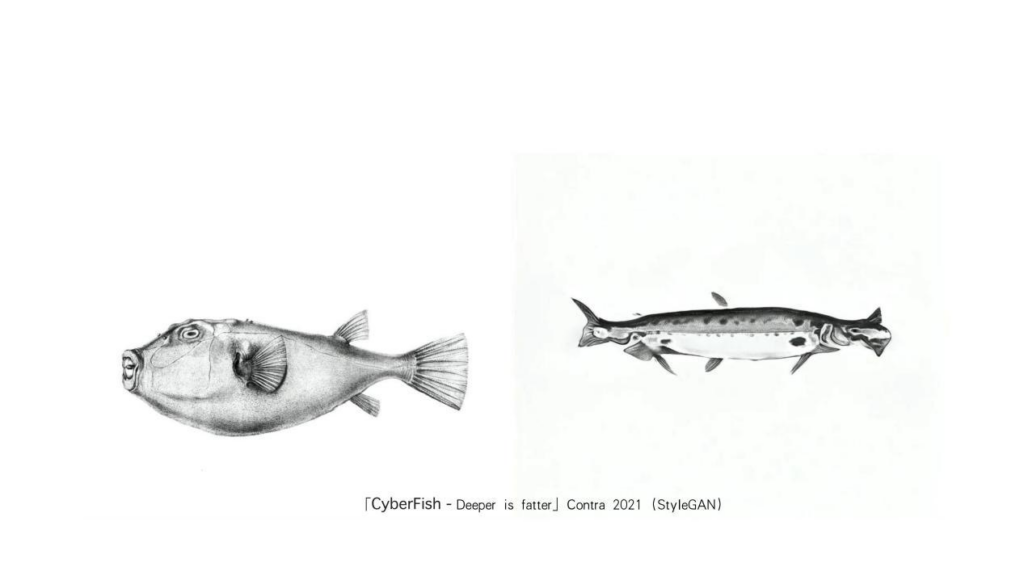 我接下来会以自己的一些作品创作过程来讲这些生成式AI,包括生成对抗网络,以及扩散模型背后的原理。《CyberFish》是从21年开始就在做的一套系列作品。那个时候还没有扩散模型,是用StyleGAN通过提示词来生成的这些鱼。作品的世界观就是一条普通的鱼,在种种事件冲击下有了一些分化和变异。那么它从左到右就会有一些视觉方面的进化,这些可能现在看都有一点粗糙,但还是很好用的。这同时也暴露了现在模型的问题:现在的模型生成的东西都太完整了,也挑不出问题来,想让它不太完整反而不是那么容易。但是以前的模型生成出来就很“艺术”,打引号的艺术。比如说中间这条鱼,它进化成身体里有一个城市的状态,那么我就来给大家分享一下它究竟是如何完成进化的。