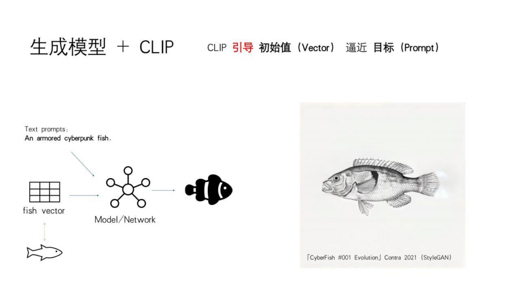 我们现在来看鱼是如何进化的,从左边一条普通的鱼进化成一条有赛博朋克风格的鱼。进化其实有两个关键点:一个是你要有一个生成模型,我刚才已经训练了一个可以生成普通鱼的模型。然后还有一个点是你要给他一个clip。这个clip模块是干嘛的呢?我们看到左下角是一条普通的鱼,它对应着一个很复杂的数,我们一般把它叫矢量(vector),然后把这个代表普通鱼的数字丢给神经网络,再给它一句提示词,它就会生成一条武装起来的赛博朋克鱼,一条风格化之后的鱼。能做到这样的关键就是clip的存在。它首先能理解这个语义。另外的一个作用是引导,就像你倒车入库,你的教练会让你往左打一点,往右打一点这类的引导。Clip会引导着你的生成模块向你的目标(target)去。也就是说在AI生成的逻辑里,你的提示词就是生成任务的一个目标,不管你生成文字也好,图像视频也好,提示词都是它的target。当我们把这个过程可视化下来,就得到一条普通的鱼,由clip引导着生成模型无限地去接近于那个目标,最终变成了一条风格化后的鱼。
