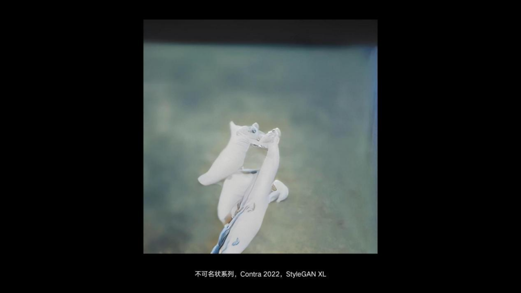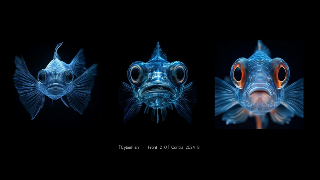 《CyberFish-Front》这个作品是22年Midjourney刚出来的时候创作的。我当时想做一组鱼的正面的作品,但是我没有那么多鱼的正脸的数据集。生物学的书里也没有,自己拍摄也拍不到那么多。Midjourneyy出来以后,我就在Midjourney里“抽卡”,生成了大概两三百张的时候,它开始出现这种看上去有点像鱼的正面的图像。当我“抽卡”到足够多的时候,我就把它们当作数据集,重新去StyleGAN里面训练,训练完以后,就用同样的套路做一些插值动画之类的,最终变成视觉性的作品。古早的AI还是很有意思的。现在的你让它生成鱼,它生成的真的就是一条鱼。