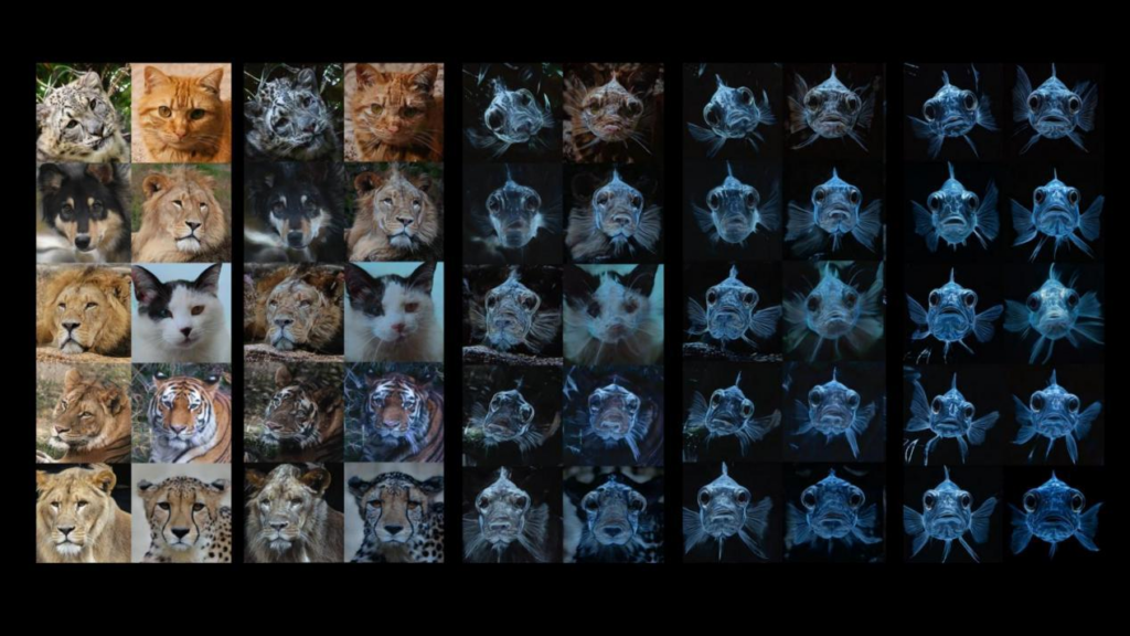 现在,我跟大家再分享一下这些鱼是怎么训练出来的。现在你们看到的这组图是狮子、老虎等猫科动物的脸。但我其实是在这组猫科动物五官的基础之上,拿它作为预训练模型,加上鱼的数据集去创作的。其实狮子、老虎的模型不是只能生成狮子和老虎,重点在于这个模型已经具备了提取动物正面五官的能力,我其实是站在这个能力之上去做自己的事。它本来是生成老虎的,但当我给它看了大量的鱼之后开始持续训练,我就成功把它带偏了。当然我也可以从零开始训练。但站在AI的基础之上训练,一是可以降低训练成本,还可以提升一些训练效果。其实我也可以基于这些狮子、老虎去训练人的生成肖像模型,重点就是这个模型它抓取五官的能力。