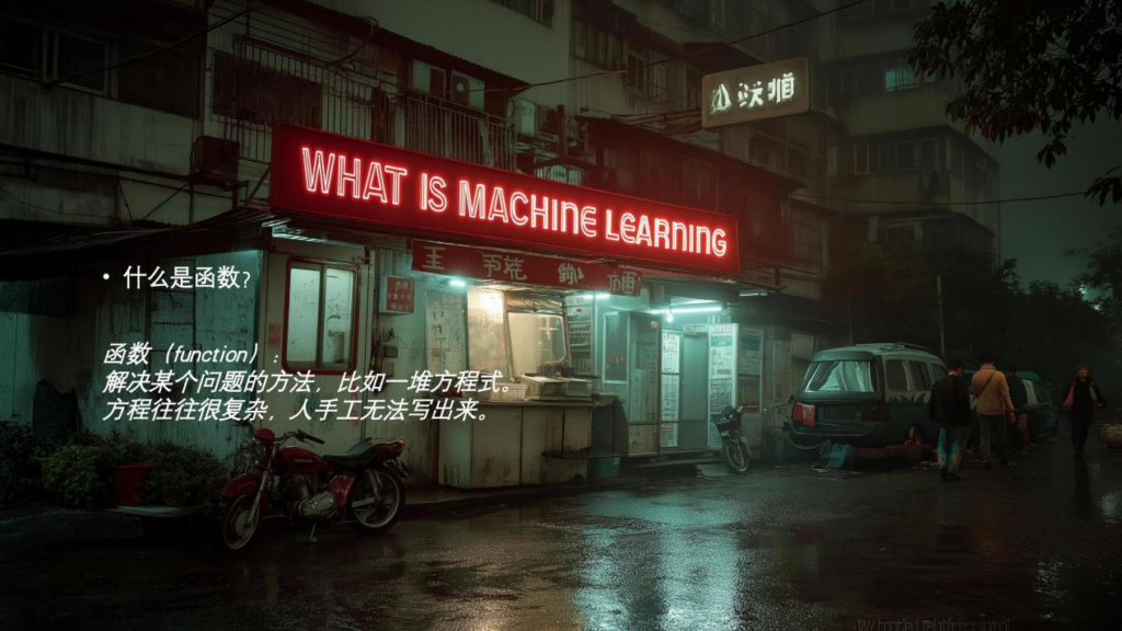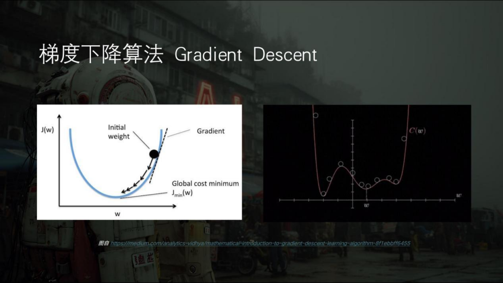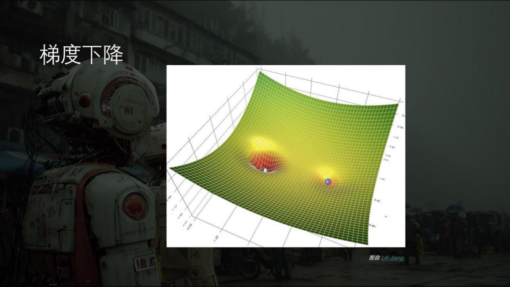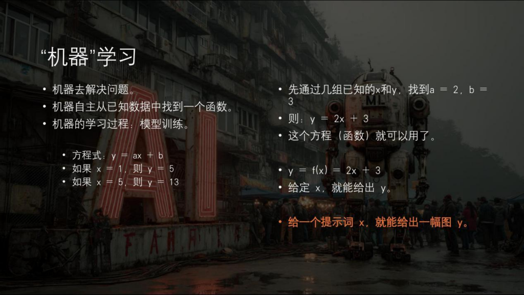 最关键一点是机器它会自主地从已知数据中寻找一个函数,所以我们会把这个机器学习的过程叫做模型训练。还是这个方程式“y=ax+b”,还是先通过已知的几组x和y找到它的参数,a和b找到以后这个方程就固定下来了,当然这个时候是机器自己去找。这样这个函数就可以用了。如果你的x是一个提示词,那么你的y就是输出的一张图。只不过这个时候的函数非常复杂,它不是“y=2x+3”这么简单的一个方程,给定输入提示词然后拿到一张输出图,这种方程式可能是我们人类很难写出来的,但是机器可以通过它的学习能力把复杂的方程式找到,这就是机器学习。但最重要的一点是为什么机器能学习?机器为什么会自主学习?这就很神奇的一点,实际上这与最基本的一个算法叫“梯度下降算法”(Gradient Descent)有关。