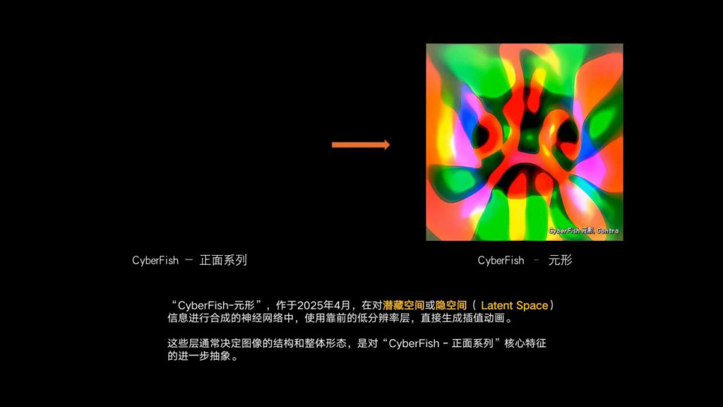 这是到了24年8月份,鱼的正面的2.0版本(《CyberFish Front 2.0》),这个时候你可以看到它已经很像鱼了。但实际上这时我反而要告诉Midjourney不要那么像鱼,要有一些惊悚的表情,像人一样的表情,比如睁大的眼睛之类的。相比第一代的时候,我要告诉它生成一条什么样的鱼,尽量生成鱼的正面。到后来要告诉它的,却更多的是一些跟鱼无关的提示词,它才可以生成我想要的东西。而且第一代的时候我是拿真实的人类图像资料作为数据集的,但这个时候我其实是拿圆环套圆环,用AI生成的内容当做数据集,去训练我自己的模型。最右边是我在它生成的插值动画的基础上加了一些算法的东西所实现的效果。