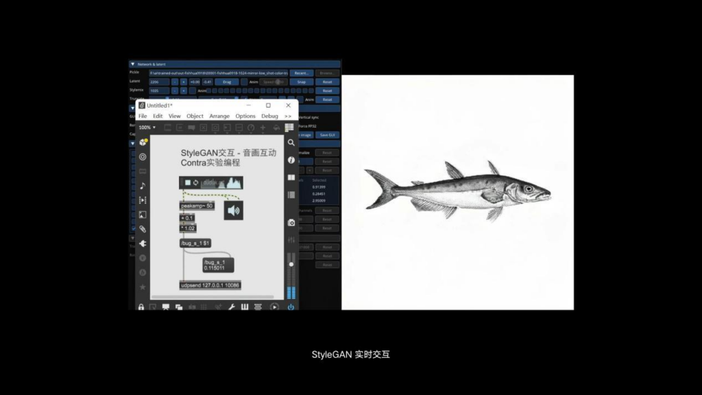 现在看到的是一个声音驱动的插值动画,StyleGAN的生成效率会比现在的AI高很多。这个动画的实现了画声实时互动的效果,音频在这里会作为另一种模态的数据来驱动这个画面,来改变当前这张图在潜空间里对应的数字。最终反映到人眼空间或者说像素空间里的画面就有了改变。也就是说你的数据来源不管是人机互动,还是传感器互动,或者来自于网络社会数据库里的一些文献的资料,总有一种数据可以和AI的生成关联起来。