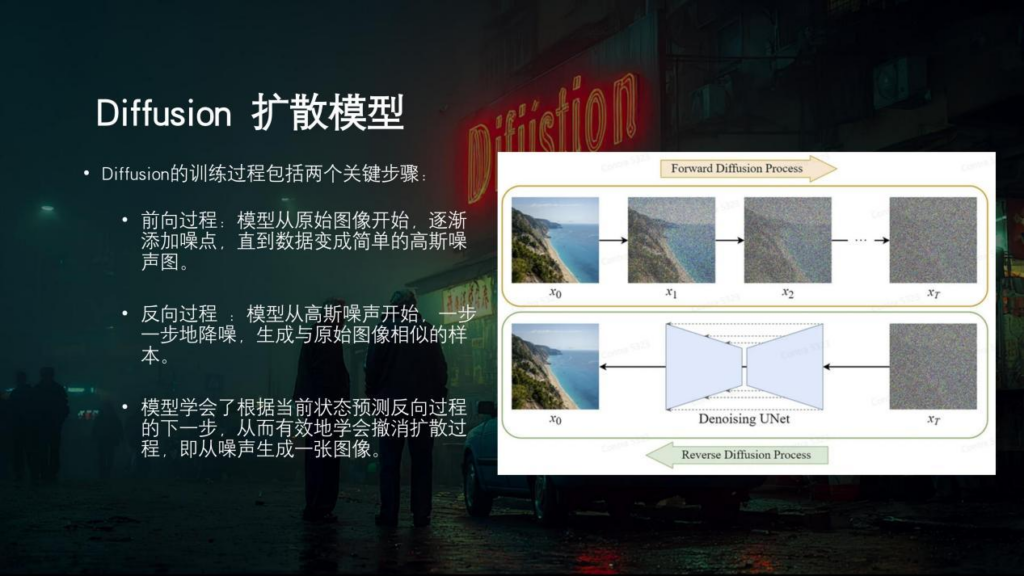 刚才讨论的是StyleGAN,现在我们要说到目前大规模应用的扩散模型,比如Stable Diffusion和Midjounnry。什么叫扩散?因为它不像生成对抗网络,有一个生成器和一个判别器博弈对抗。如果在训练扩散模型时给它一张风景的图,然后一步一步给它叠加噪声,让它自己学着去反向操作这些过程。也就是把这些噪声一层层地去掉,之后就会得到新的一张图,尽量去接近那张原始的图,这就完成了一次学习。经过无数次这种学习后,你任意给它一张噪声图以及提示词,它就可以还原出你提示词的目标。这就是扩散模型。