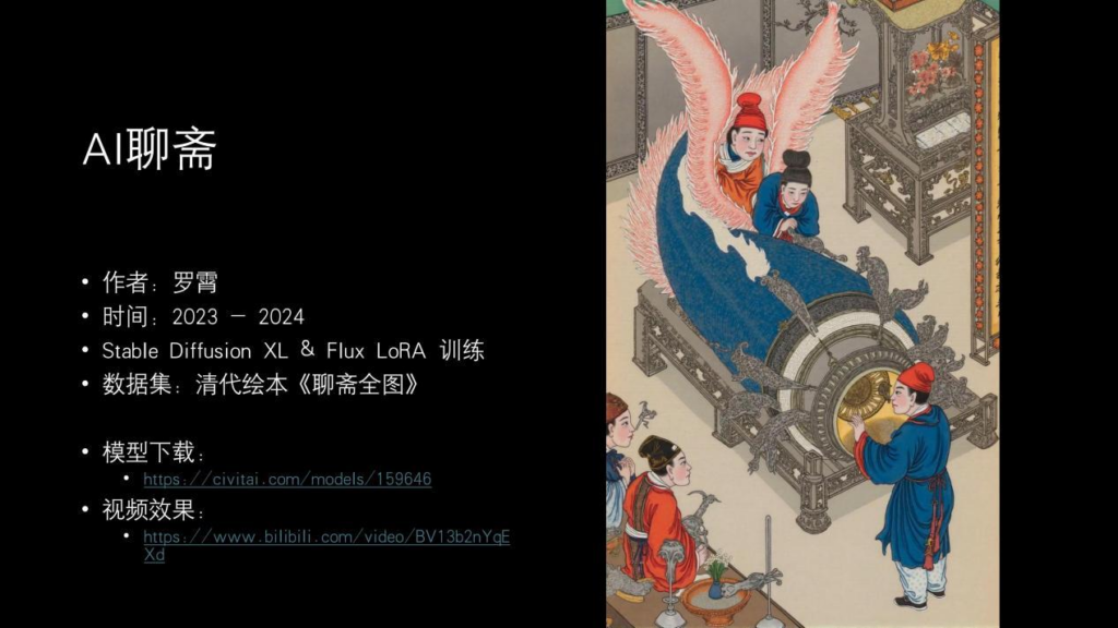 这是我前两年用Stable Diffusion训练的一组作品叫《AI聊斋》,它用到的数据集是清代的一套绘本《聊斋全图》。我先去获得了古籍《聊斋全图》,它可以在“书阁”网站上公开下载。然后我就把它作为数据集训练之后去做了这样一个模型,有了这个模型就可以生成更多跟《聊斋全图》里的人物和画风相关的内容。现在图生视频非常方便,有了图顺便丢进去,几秒钟之后就可以拿到一个视频,这也就是模型训练的一个好处或者说意义。